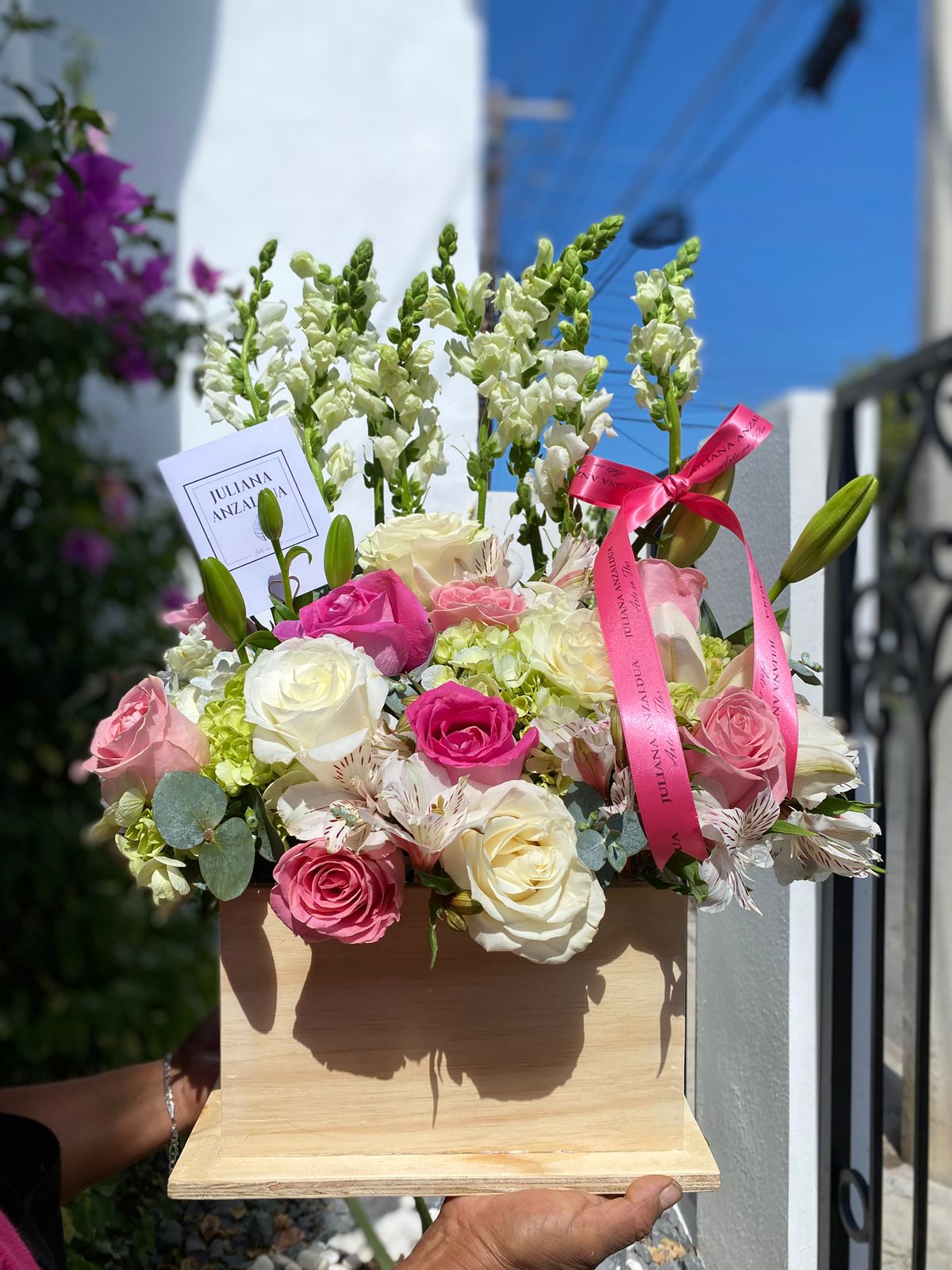 Arreglo colorido con 12 rosas, hortenisas, perritos en base de madera