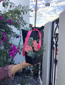Combinación de 6 rosas rosa y eucalipto.