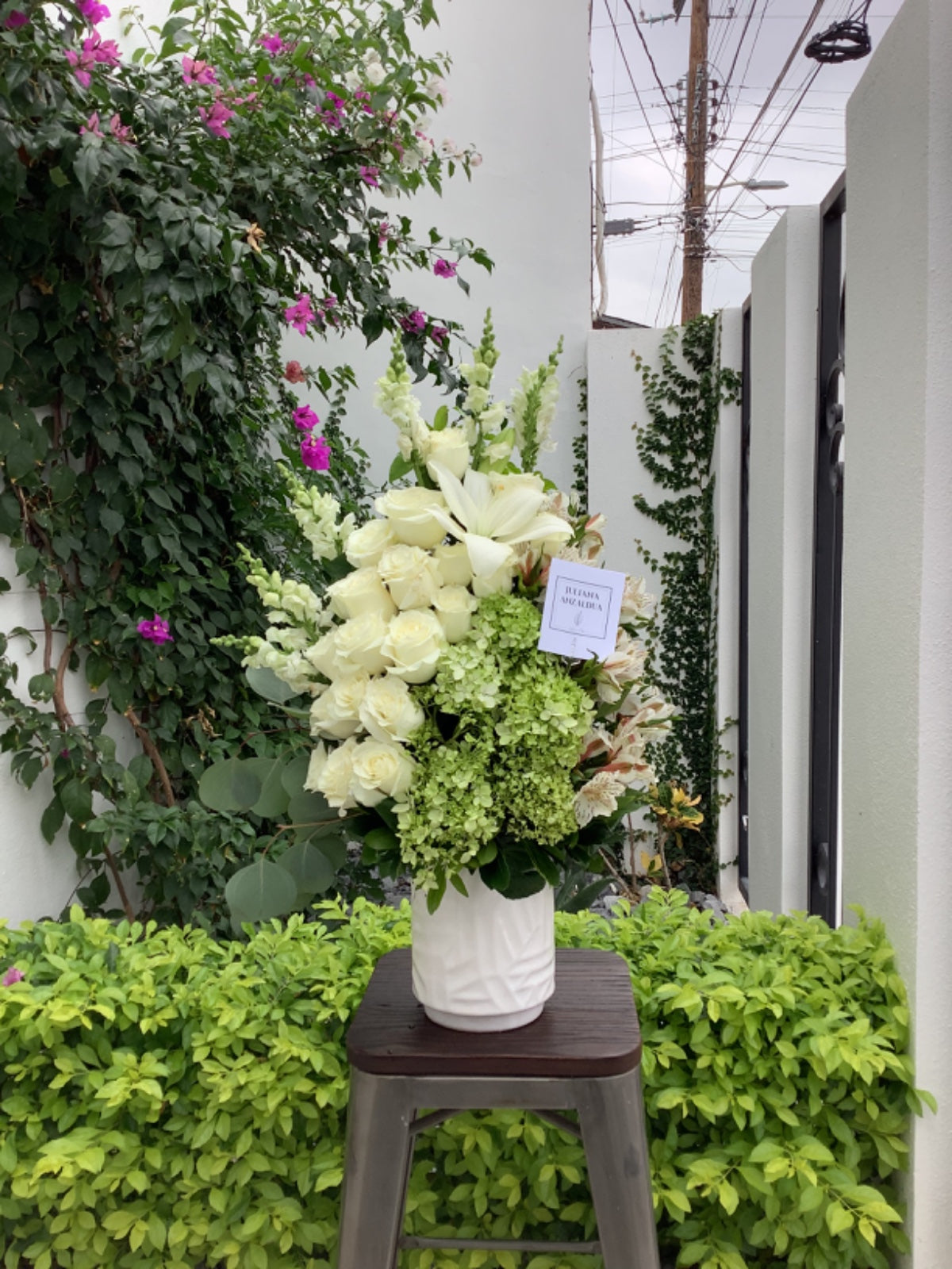 Arreglo floral en tonos blancos, con hortensia verde, lily, perritos y follaje con base de cerámica en blanco.