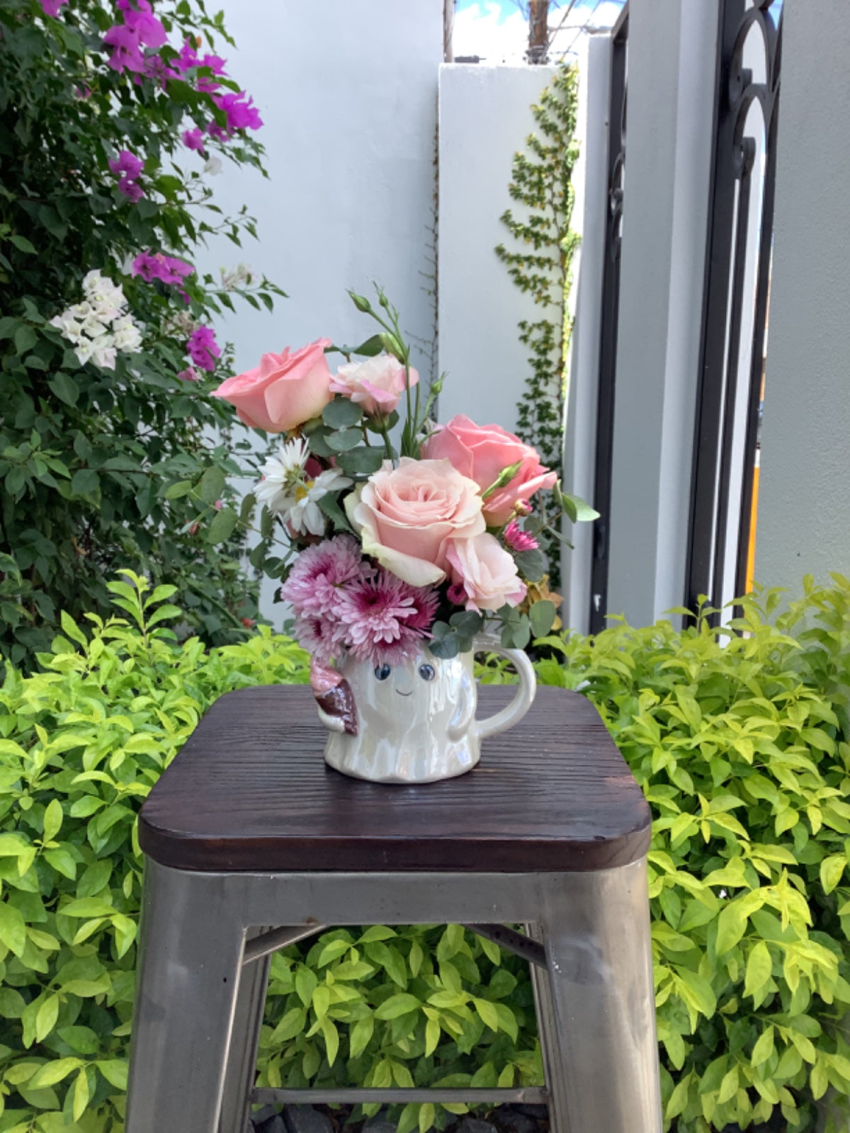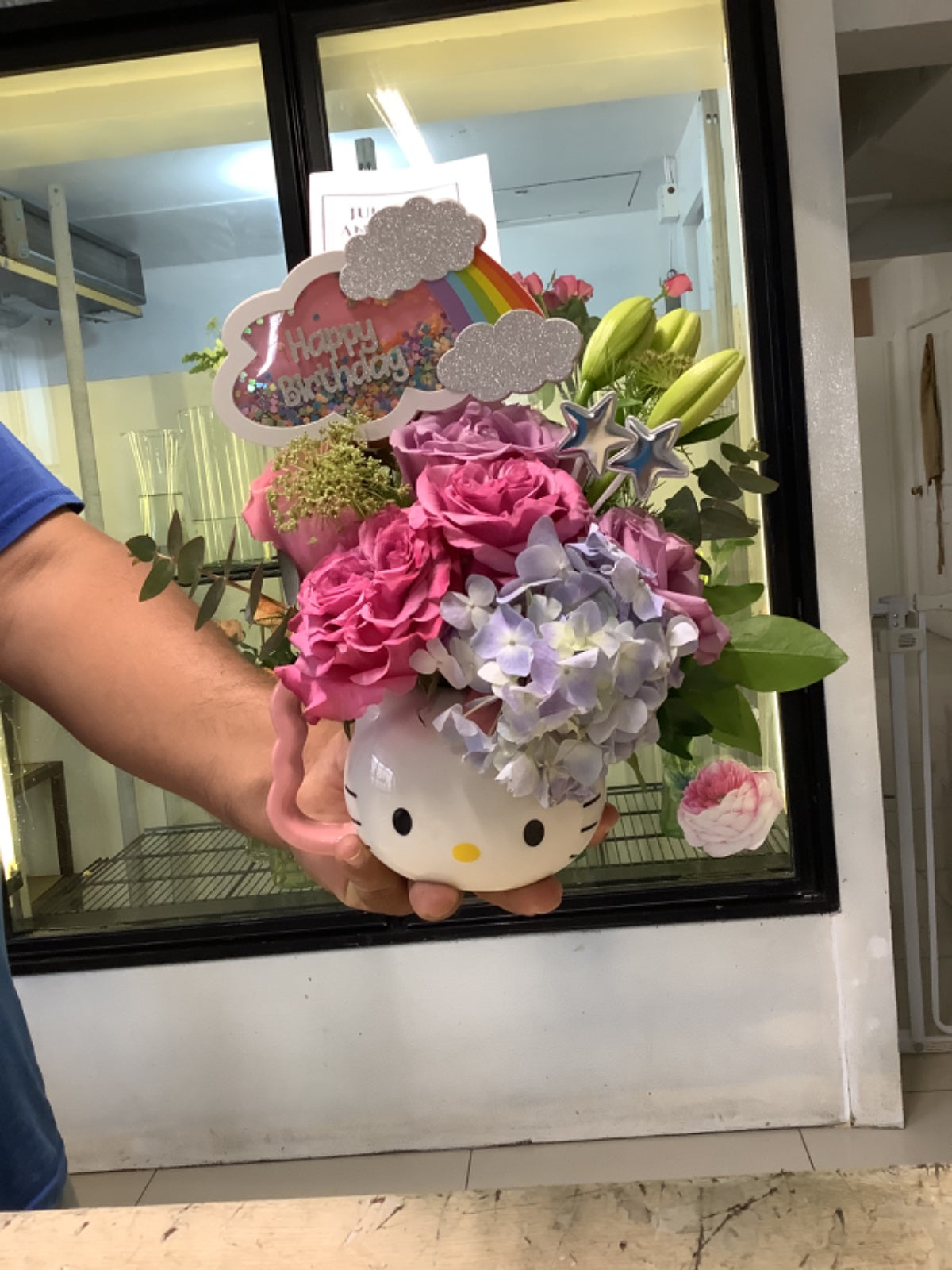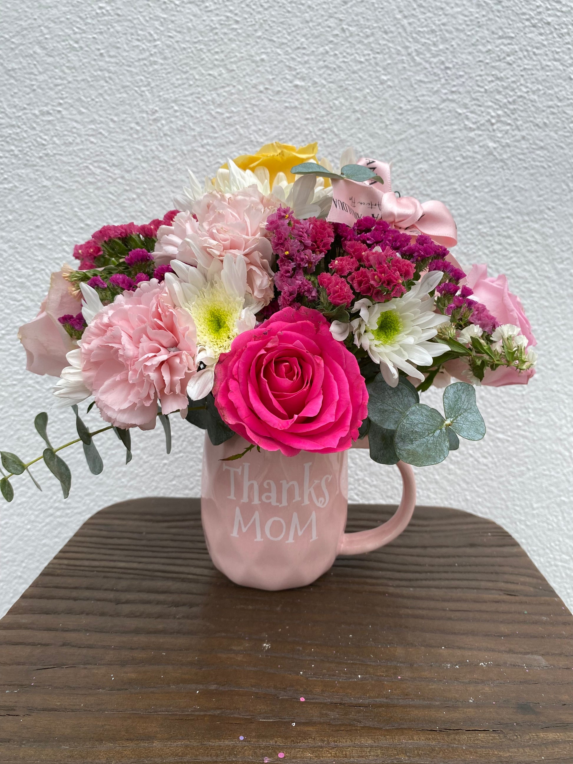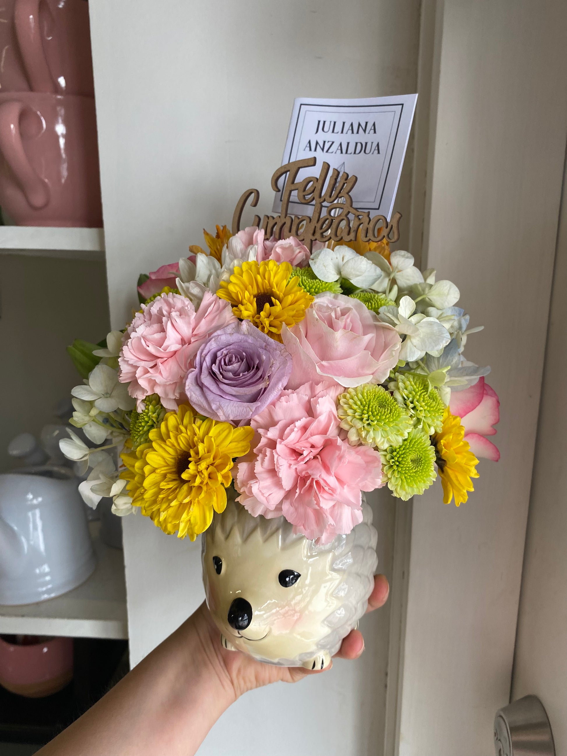 Arreglo colorido con 6 rosas y flor variada en taza de cerámica,